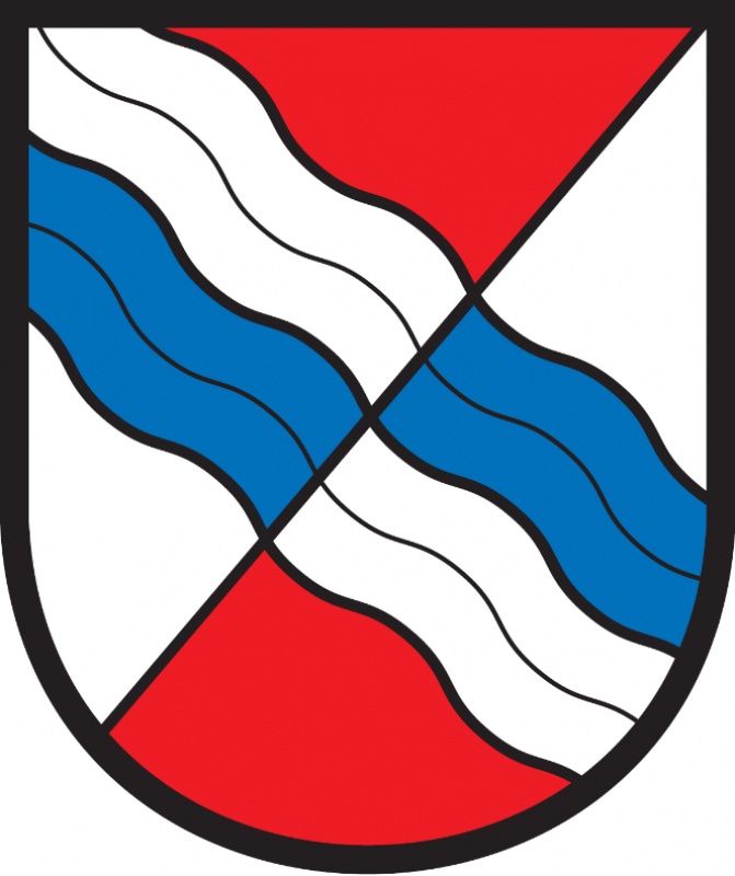 Im Schragenschnitt geteilt von Rot und Silber, belegt mit einem rechtsschrägen Doppelwellenbalken von Silber und Blau in gewechselten Farben.